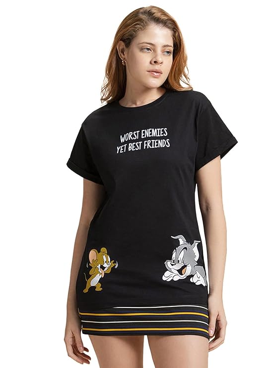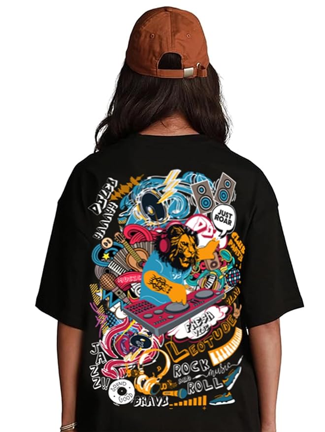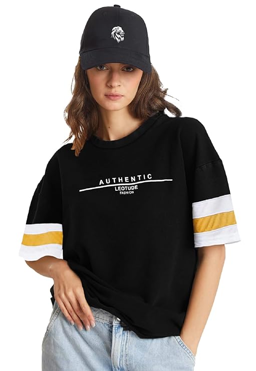 LEOTUDE Women's Short Sleeve with Round Neck, Oversized Longline Drop Shoulder, Back Printed T-Shirt (Color Black)
